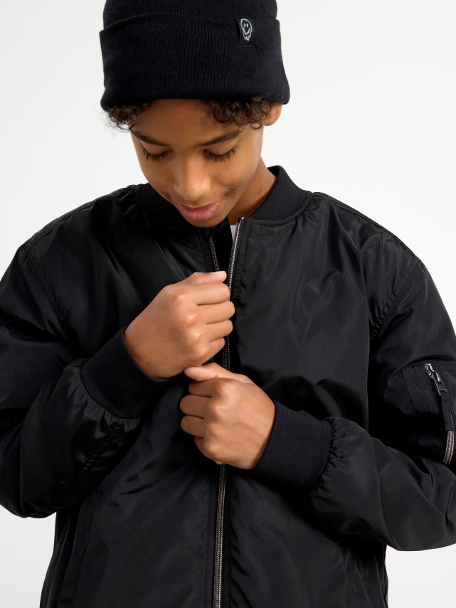 une veste confortable et hydrofuge dans un style bomber avec une fermeture éclair sur une manche, des poches latérales et une poche intérieure. matériel. cette pièce est fabriquée à partir de polyester recyclé. Lorsque l’on utilise du polyester recyclé, cela signifie que des matériaux qui ont déjà été produits, comme les bouteilles en PET, ont une autre chance. il est beaucoup plus économe en ressources que la production de nouveaux matériaux, ce qui le rend meilleur pour l’environnement et réduit l’impact climatique.