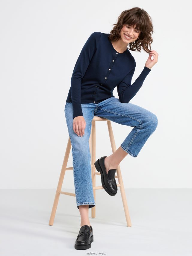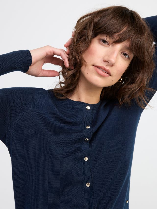 un cardigan au look classique avec une coupe légèrement plus courte. le tissu doux en maille fine et les boutons brillants en font une pièce polyvalente à porter aussi bien au quotidien que sur une robe de soirée.