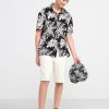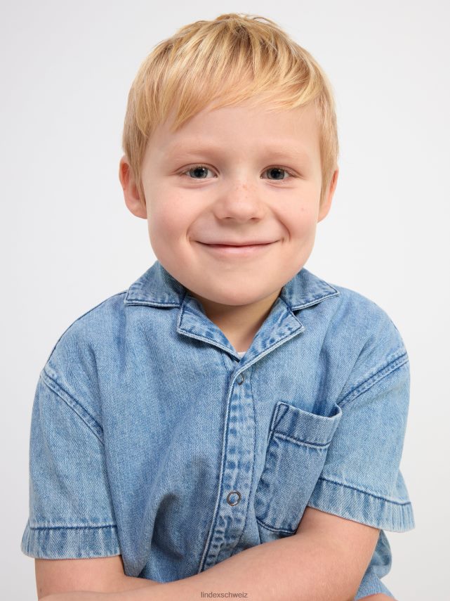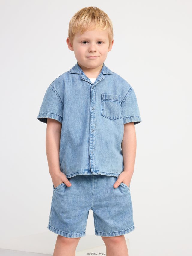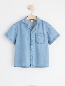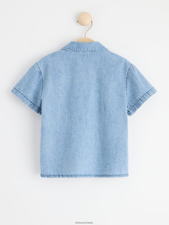 une chemise en jean doux à manches courtes avec un col, une poche sur la poitrine et une fermeture à bouton-poussoir sur le devant.