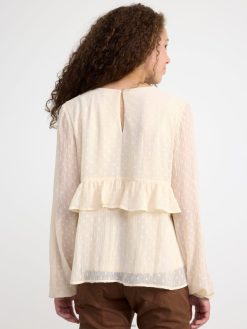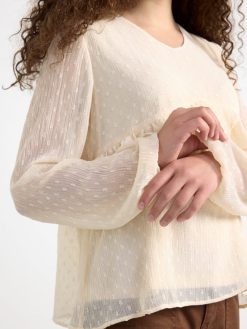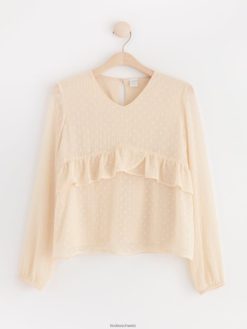 un chemisier romantique avec un motif à pois sur toute la surface et des volants sur le devant et dans le dos. matériel. cette pièce est partiellement fabriquée en polyester recyclé. Lorsque l’on utilise du polyester recyclé, cela signifie que des matériaux qui ont déjà été produits, comme les bouteilles en PET, ont une autre chance. il est beaucoup plus économe en ressources que la production de nouveaux matériaux, ce qui le rend meilleur pour l’environnement et réduit l’impact climatique.