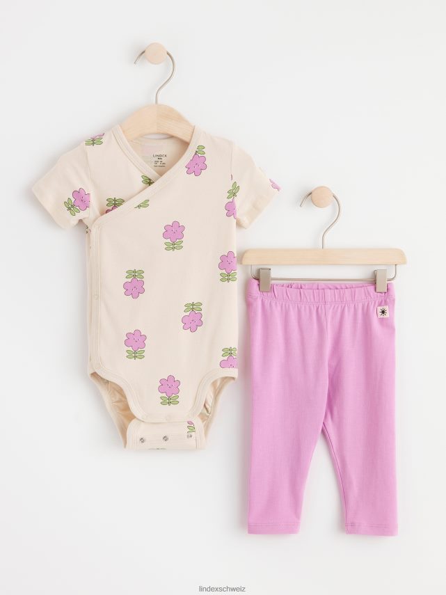 un petit ensemble confortable comprenant un body cache-cœur à manches courtes avec des fleurs lilas et des leggings assortis. le body présente notre solution intelligente de taille étendue avec deux rangées de boutons-poussoirs à l’entrejambe, permettant au bébé de porter le vêtement plus longtemps. matériel. c’est une pièce certifiée Gots. il est fabriqué à partir de coton biologique et chaque étape de la production a été certifiée de manière indépendante pour garantir qu’elle respecte les exigences sociales et environnementales de gots (norme mondiale des textiles biologiques).