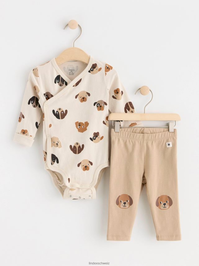 ensemble confortable comprenant un body cache-cœur à manches longues avec un imprimé de chien sur toute la surface, assorti à des leggings de couleur unie avec des imprimés de chien sur les genoux. grâce à notre solution intelligente de taille étendue, avec deux rangées de boutons poussoirs à l’entrejambe, bébé peut grandir d’une taille tout en gardant le même vêtement. matériel. c’est une pièce certifiée Gots. il est fabriqué à partir de coton biologique et chaque étape de la production a été certifiée de manière indépendante pour garantir qu’elle respecte les exigences sociales et environnementales de Gots (norme mondiale des textiles biologiques).