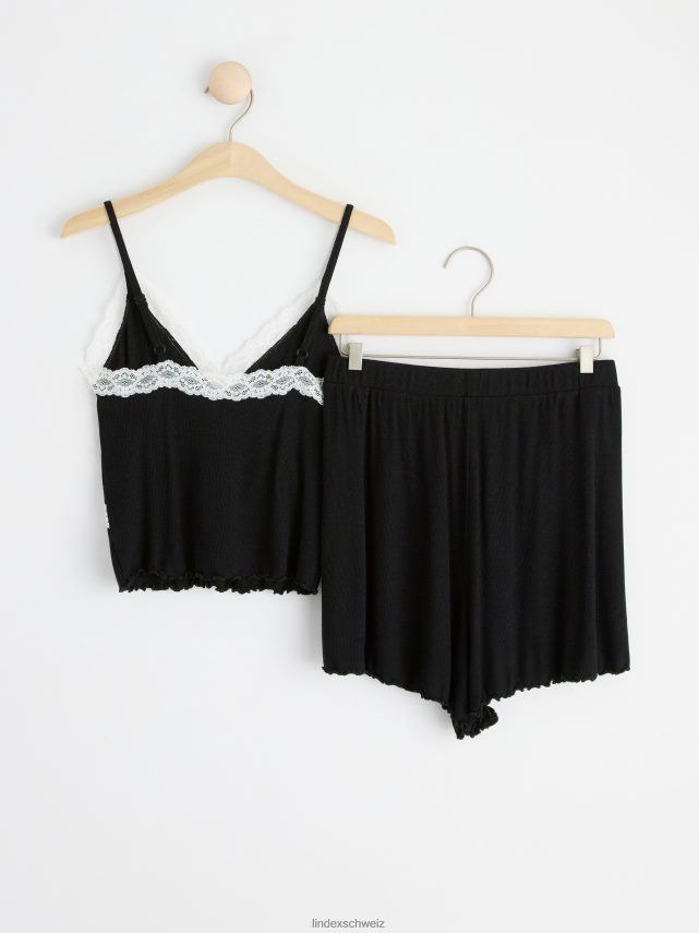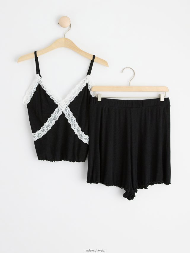 un ensemble côtelé ultra doux comprenant un caraco avec détails en dentelle et un short assorti. matériel. cette pièce est fabriquée en écovero Lenzing, une option plus durable par rapport à la viscose conventionnelle. le matériau provient d’une foresterie responsable et est produit avec un impact moindre sur l’environnement.