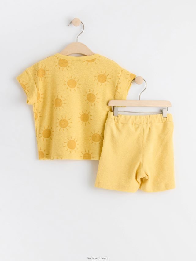 un ensemble confortable en coton éponge doux comprenant un haut à manches courtes avec un motif soleil sur l’ensemble et un short assorti. matériel. c’est une pièce certifiée Gots. il est fabriqué à partir de coton biologique et chaque étape de la production a été certifiée de manière indépendante pour garantir qu’elle respecte les exigences sociales et environnementales de Gots (norme mondiale des textiles biologiques).
