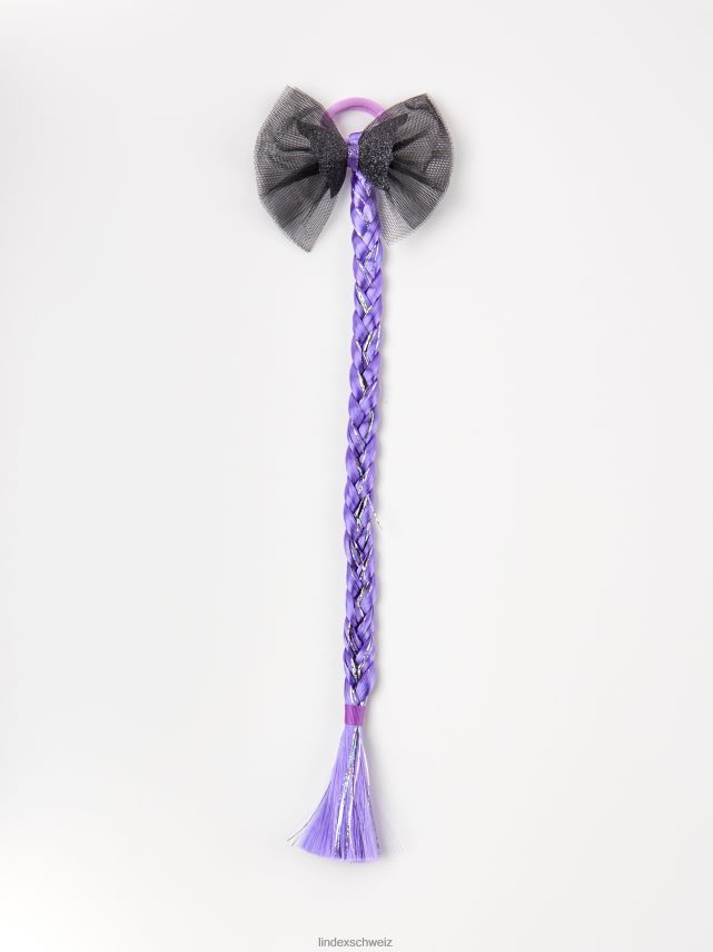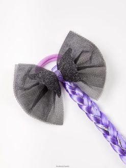 un accessoire pour cheveux noir et violet avec une longue tresse de faux cheveux sur un élastique à cheveux, terminé par un gros nœud en haut.