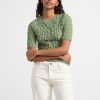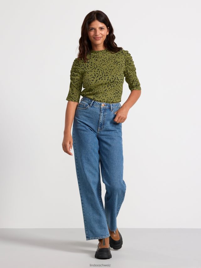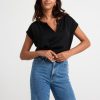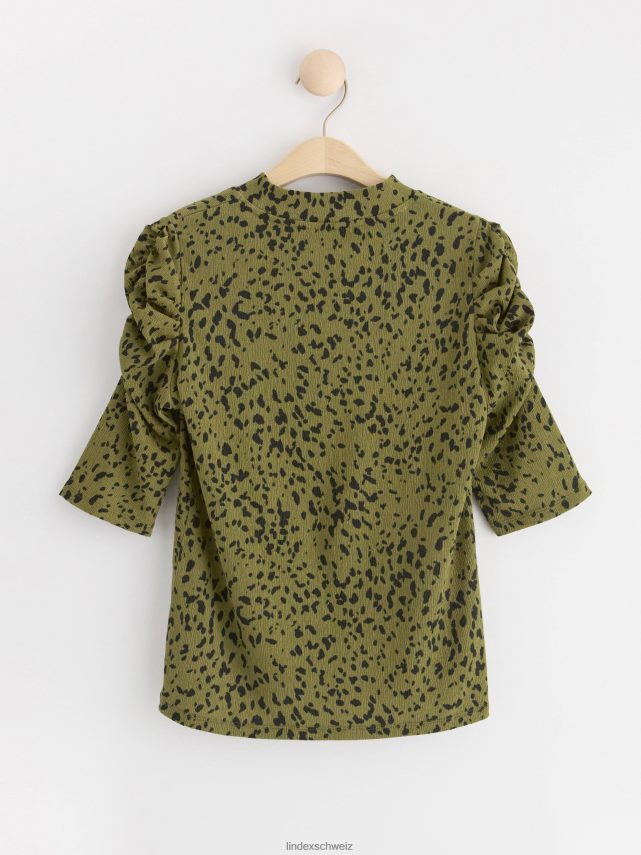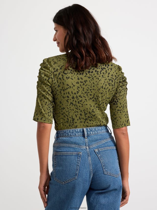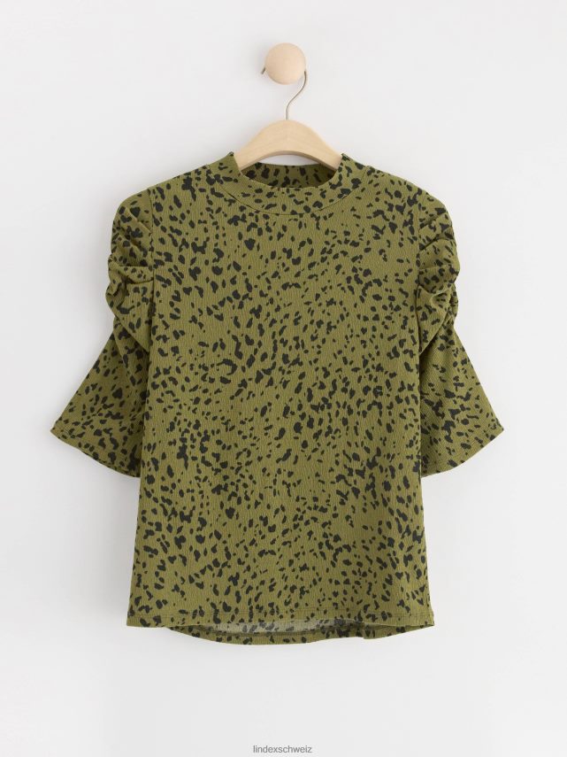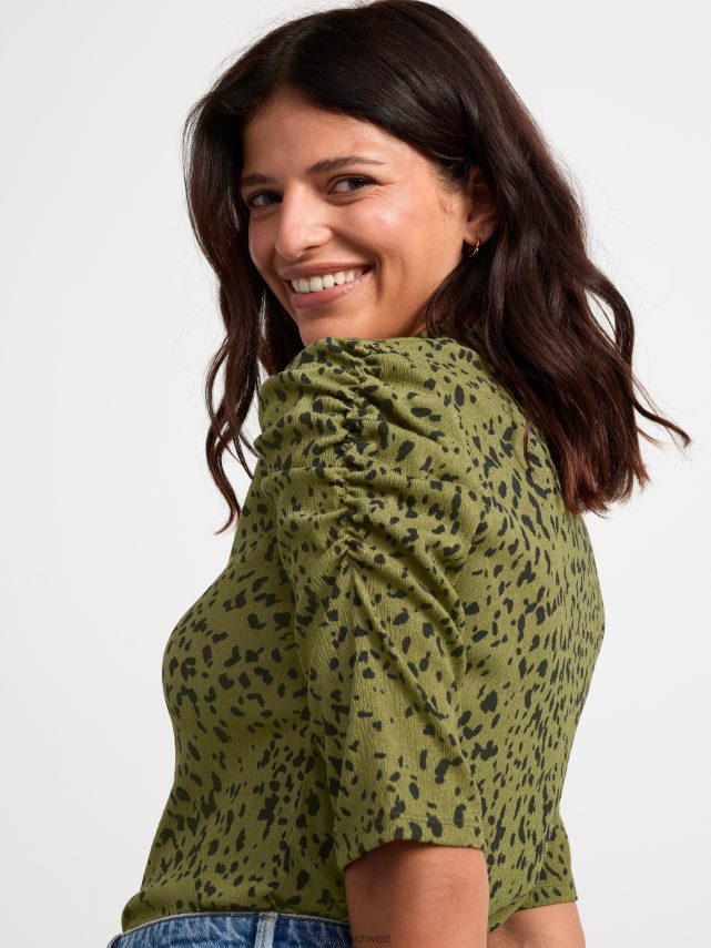 top texturé à manches courtes, fronces aux épaules, coupe droite et encolure haute.