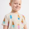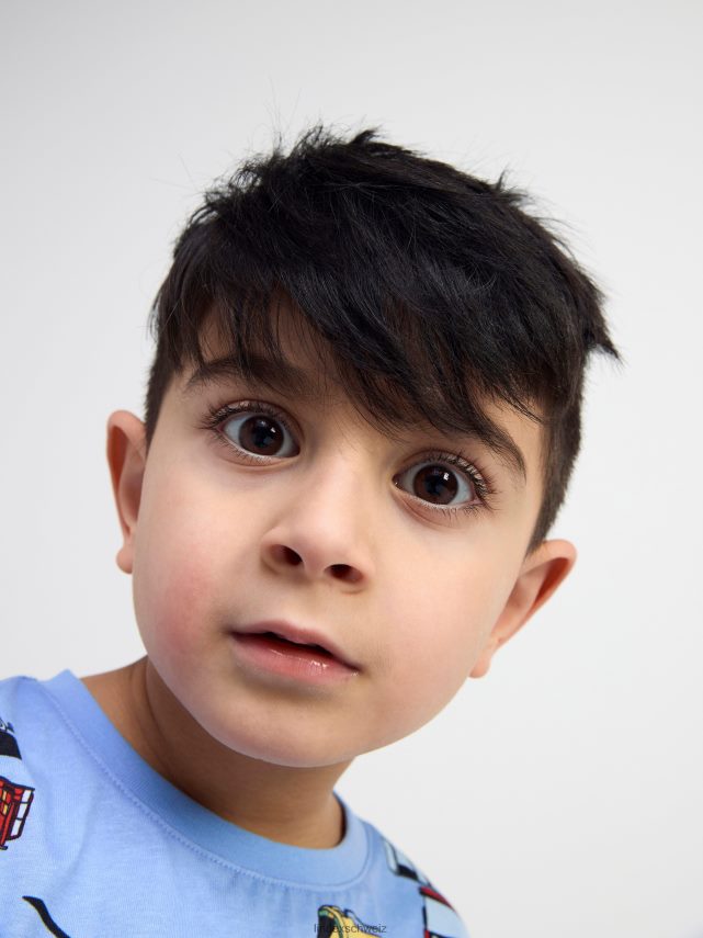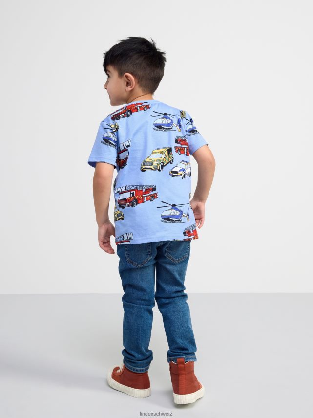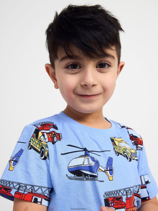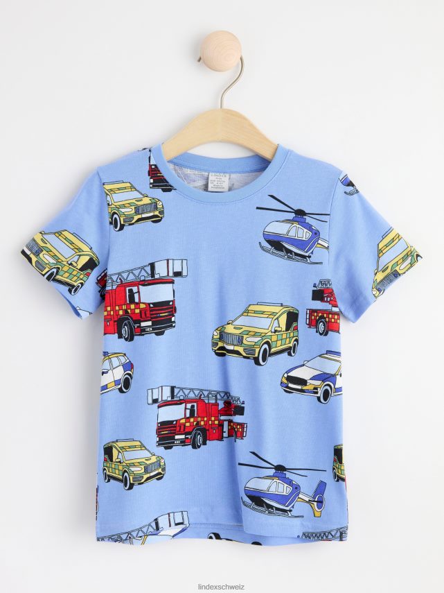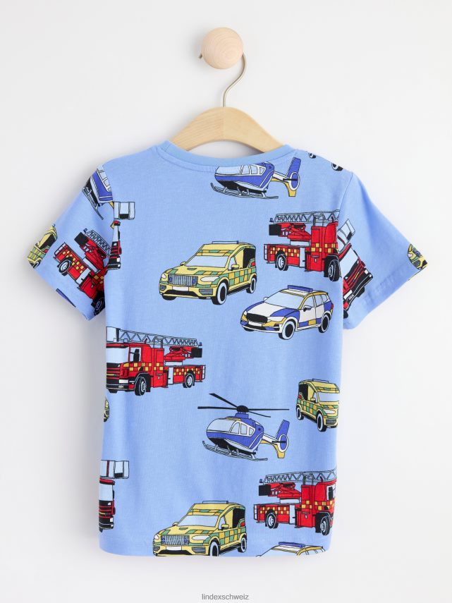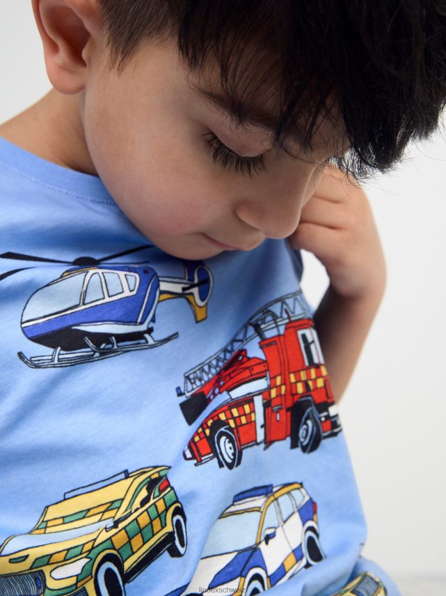 un haut doux à manches courtes avec un imprimé intégral avec des véhicules de secours. matériel. cette pièce est partiellement fabriquée en coton recyclé. en utilisant du coton recyclé, cela signifie que le coton qui a déjà été cultivé et qui aurait été gaspillé a une autre chance. c’est beaucoup plus économe en ressources et en eau par rapport à la culture de nouveau coton.