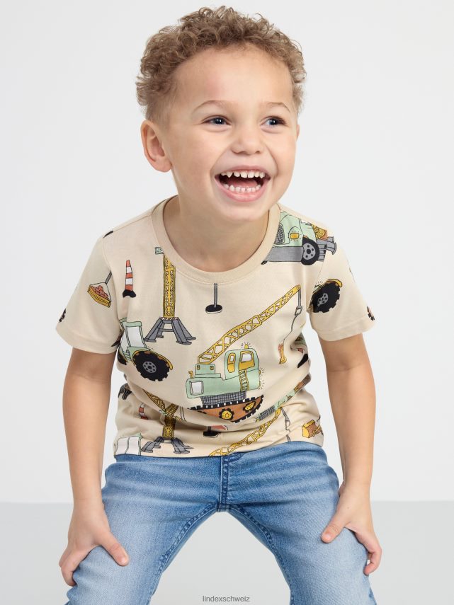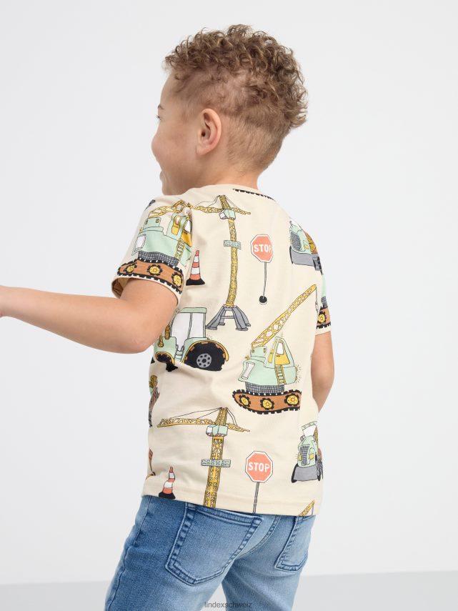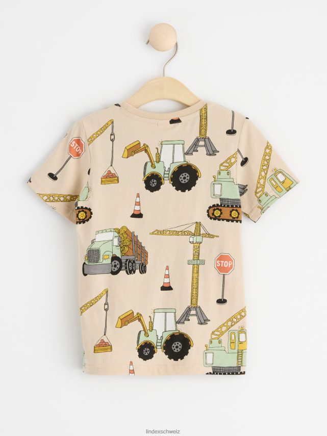 haut doux à manches courtes avec un motif de véhicules de travail sur l’ensemble. matériel. c’est une pièce certifiée Gots. il est fabriqué à partir de coton biologique et chaque étape de la production a été certifiée de manière indépendante pour garantir qu’elle respecte les exigences sociales et environnementales de Gots (norme mondiale des textiles biologiques).