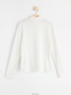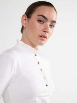 un haut en jersey à manches longues confortable et élégant avec un col à volants et des boutons dorés. matériel. c’est une pièce certifiée Gots. il est fabriqué à partir de coton biologique et chaque étape de la production a été certifiée de manière indépendante pour garantir qu’elle respecte les exigences sociales et environnementales de Gots (norme mondiale des textiles biologiques).