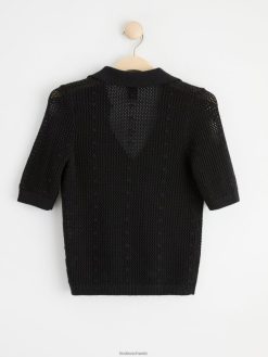 un haut à manches courtes en matière tricotée à trous, avec un col en V et un col. matériel. cette pièce est partiellement fabriquée en coton recyclé. en utilisant du coton recyclé, cela signifie que le coton qui a déjà été cultivé et qui aurait été gaspillé a une autre chance. c’est beaucoup plus économe en ressources et en eau par rapport à la culture de nouveau coton.
