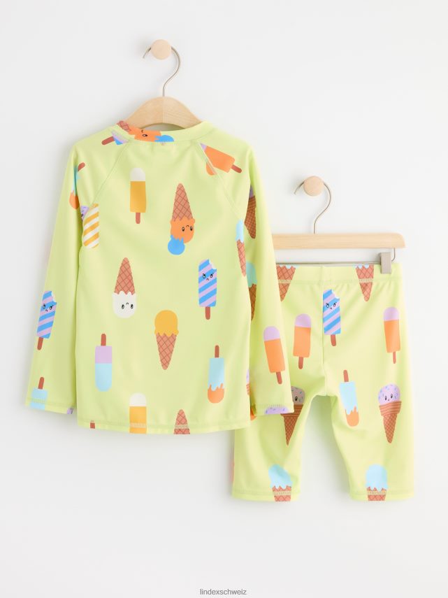 un ensemble de protection solaire comprenant un haut à manches longues et un short de motard, avec UPF 50+ et un imprimé crème glacée intégral. matériel. cette pièce est partiellement fabriquée en polyester recyclé. Lorsque l’on utilise du polyester recyclé, cela signifie que des matériaux qui ont déjà été produits, comme les bouteilles en PET, ont une autre chance. il est beaucoup plus économe en ressources que la production de nouveaux matériaux, ce qui le rend meilleur pour l’environnement et réduit l’impact climatique.