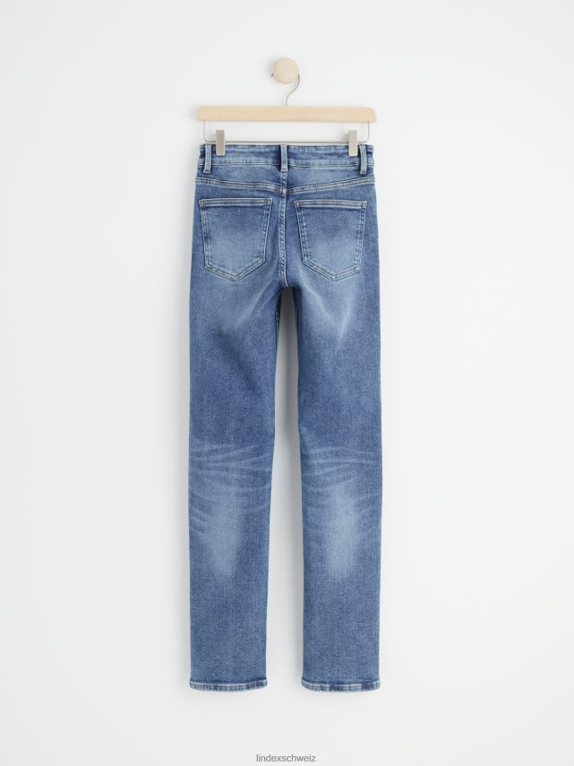 notre jean super confortable et extensible coupe alba avec une jambe droite fine, une taille classique et une qualité avec beaucoup d’élasticité. ici dans un délavage bleu moyen.