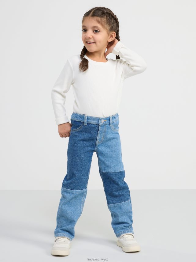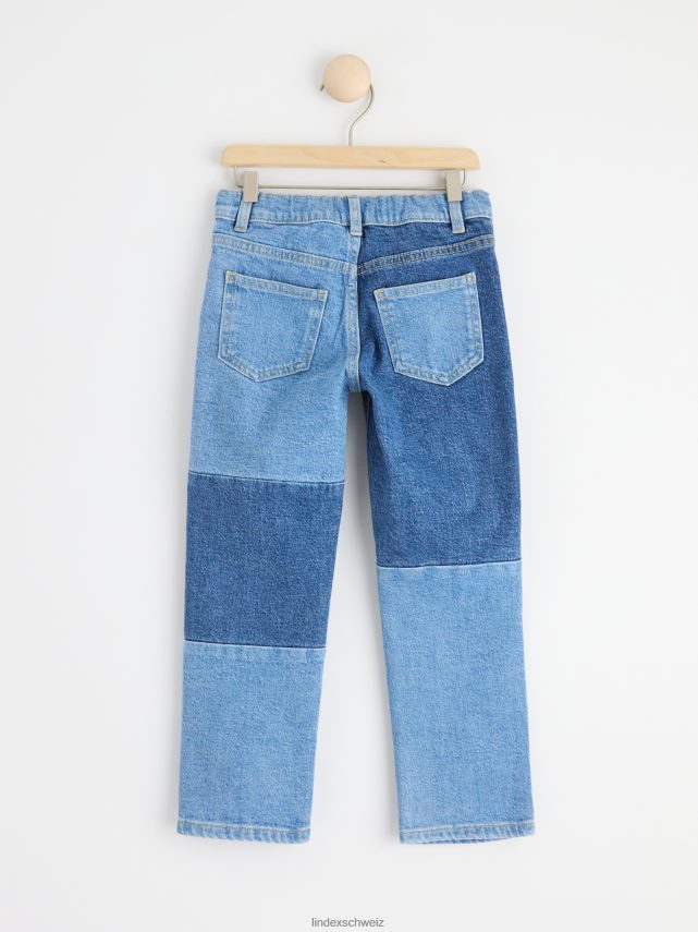 une paire de jeans droits et robustes à taille classique avec des détails en patchwork, une taille élastique réglable et une fausse braguette et une fermeture à bouton. matériel. cette pièce est partiellement fabriquée en coton recyclé. en utilisant du coton recyclé, cela signifie que le coton qui a déjà été cultivé et qui aurait été gaspillé a une autre chance. c’est beaucoup plus économe en ressources et en eau par rapport à la culture de nouveau coton.