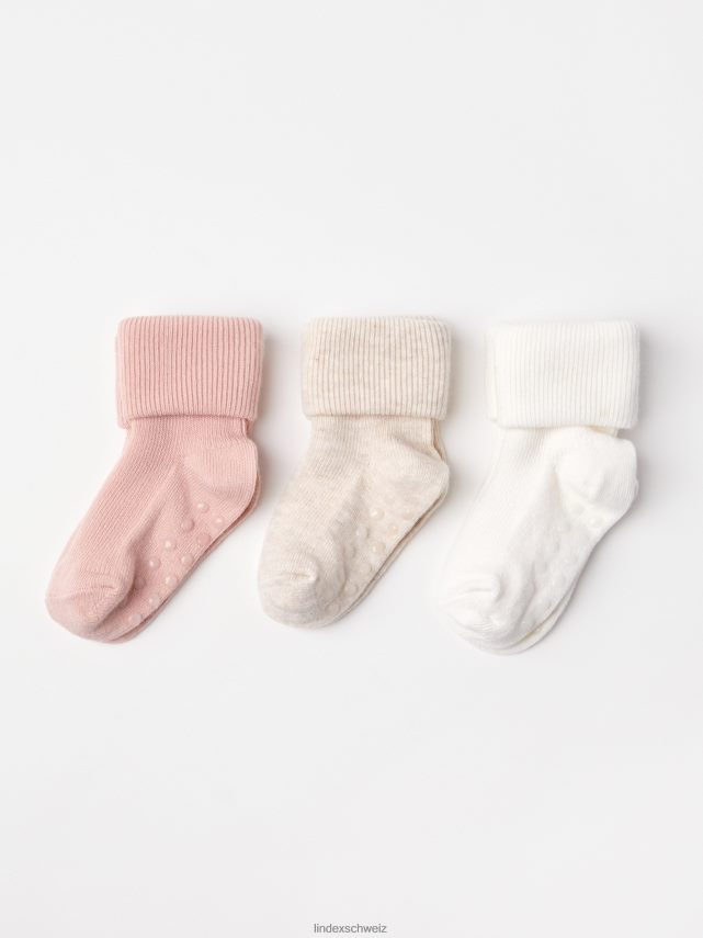 trois chaussettes roses, grises et blanches confectionnées en mélange de coton biologique avec de longs revers côtelés pliables. Les tailles 19/21 et plus sont livrées avec antidérapant.