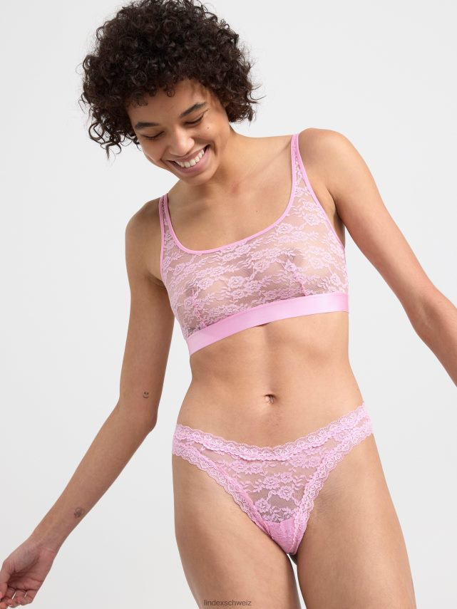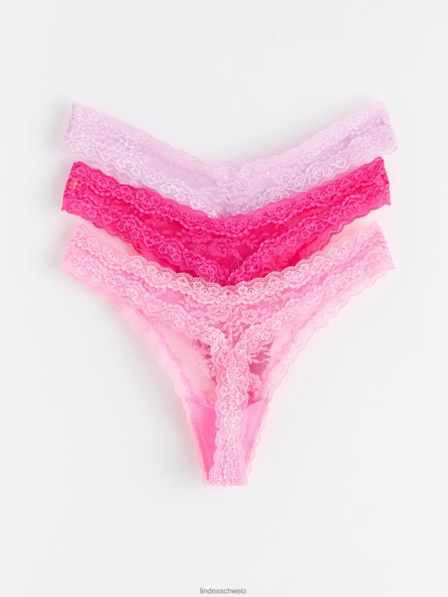 trois strings avec une jambe haute et de la dentelle sur toute la surface, de différentes couleurs.