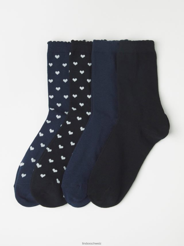 quatre paires de chaussettes en mélange de coton doux. deux paires de couleurs unies et deux avec un motif cœur intégral, toutes avec un joli ourlet à volants sur le dessus.