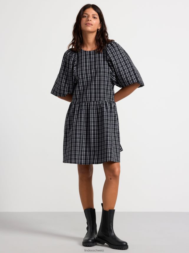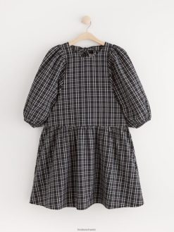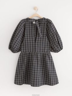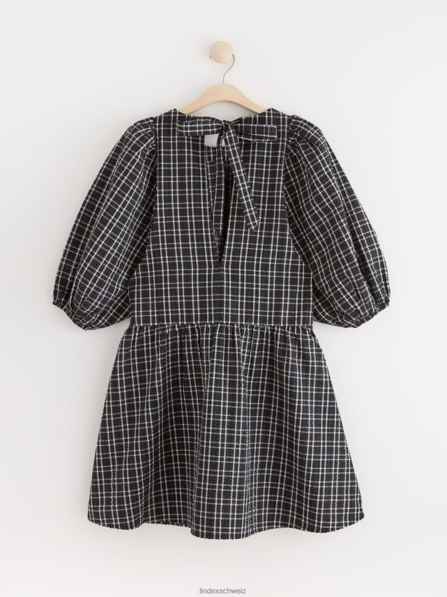 mini-robe tissée à manches 3/4, coupe ample, encolure ronde et bande à nouer sur la nuque.