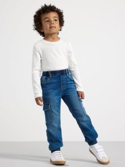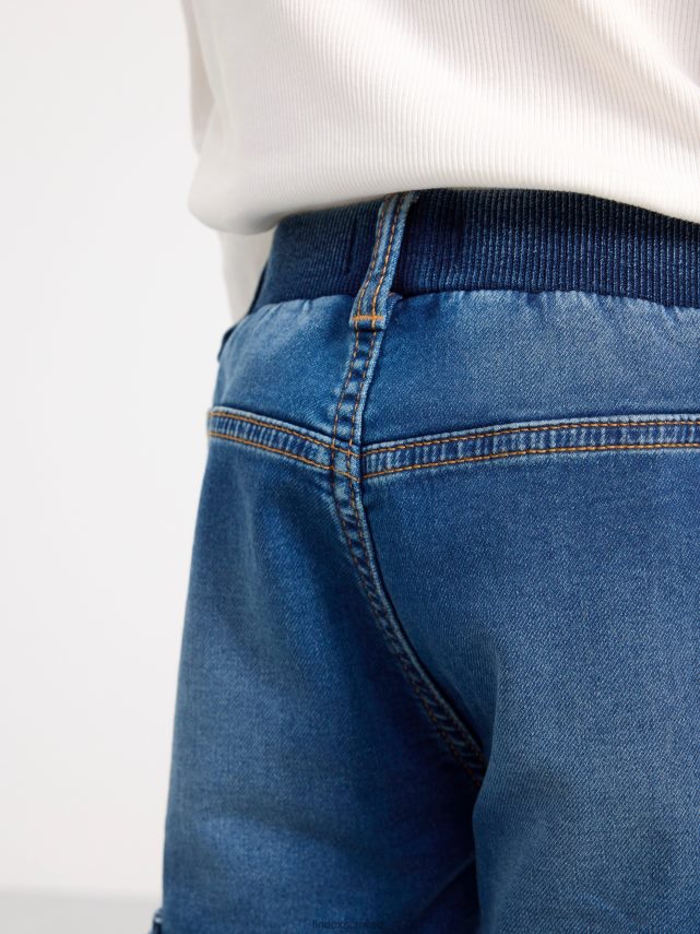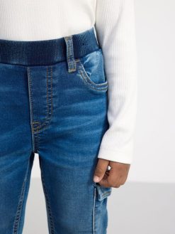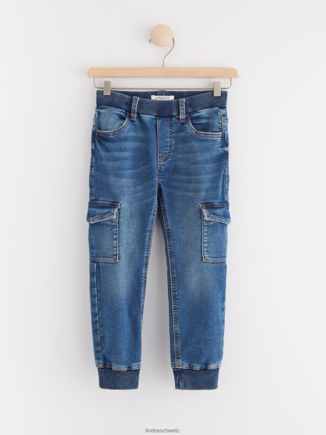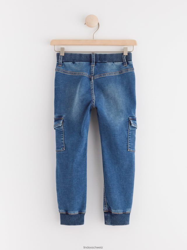 Jogger style cargo en jersey denim doux avec de grandes poches sur les côtés des jambes, une taille élastiquée et des ourlets côtelés.