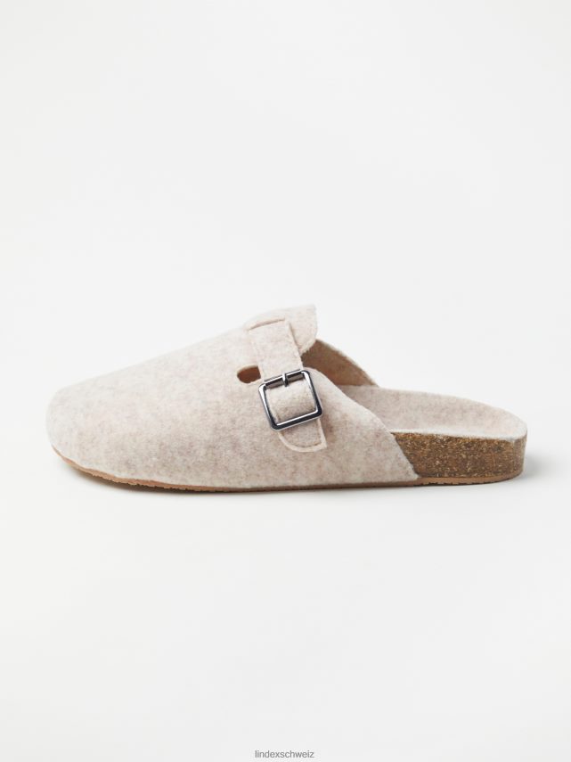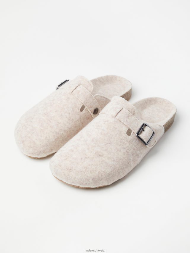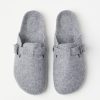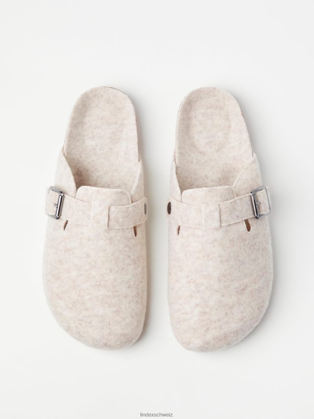 chaussons doux et confortables en matière feutrée avec une boucle en métal sur le côté. matériel. cette pièce est partiellement fabriquée en polyester recyclé. Lorsque l’on utilise du polyester recyclé, cela signifie que des matériaux qui ont déjà été produits, comme les bouteilles en PET, ont une autre chance. il est beaucoup plus économe en ressources que la production de nouveaux matériaux, ce qui le rend meilleur pour l’environnement et réduit l’impact climatique.