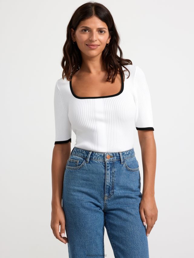 un pull à manches courtes en tricot côtelé doux, une encolure ronde et une bordure contrastée au niveau du col et de l’ouverture des manches.
