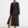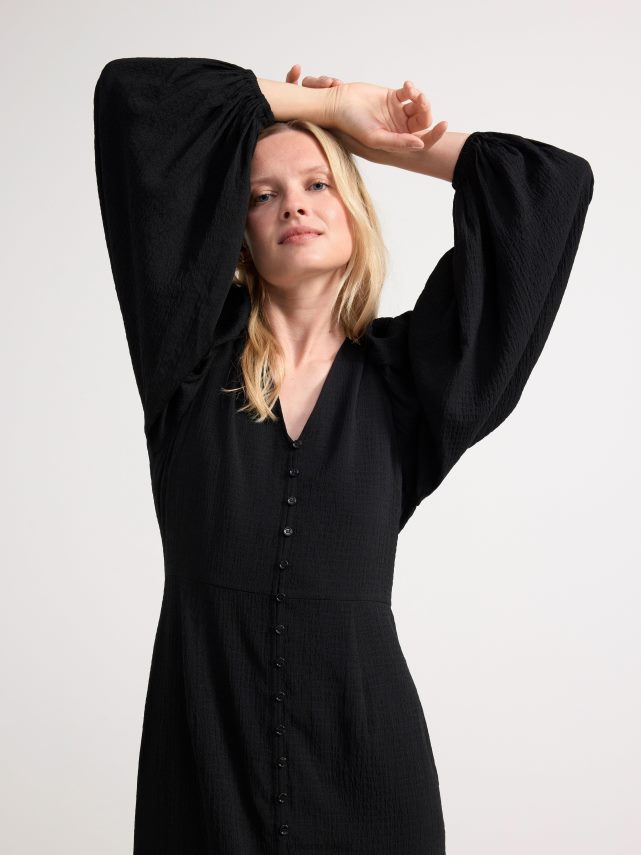 une robe mi-longue en viscose mélangée tissée et texturée avec un col en V, une fermeture boutonnée sur le devant et des manches longues volumineuses.