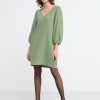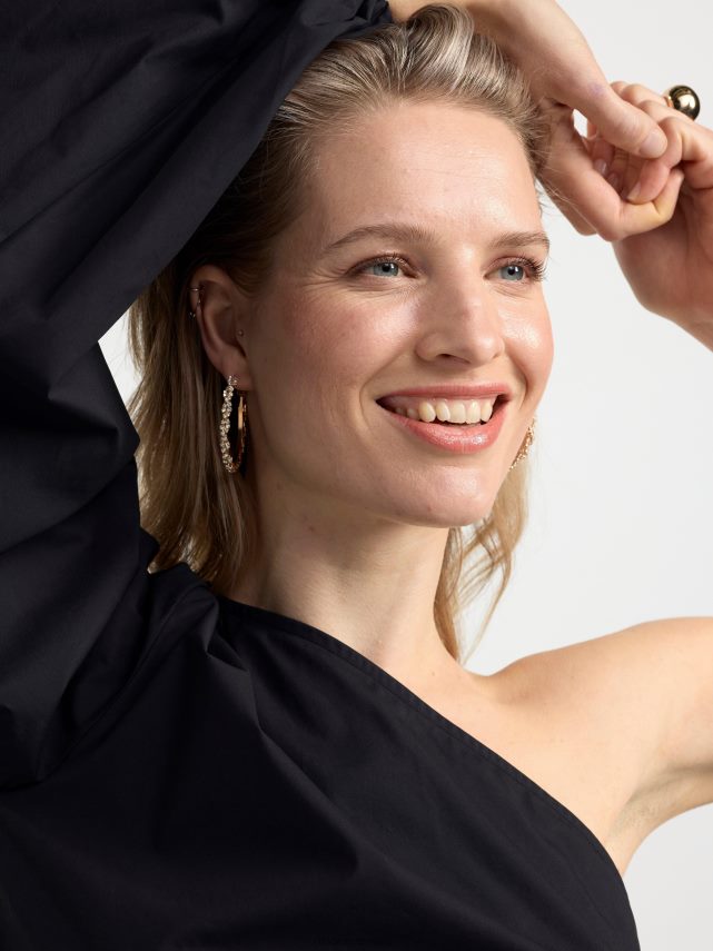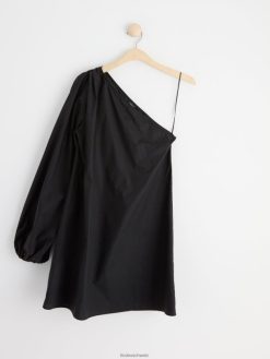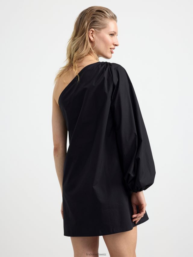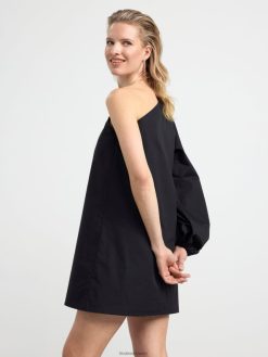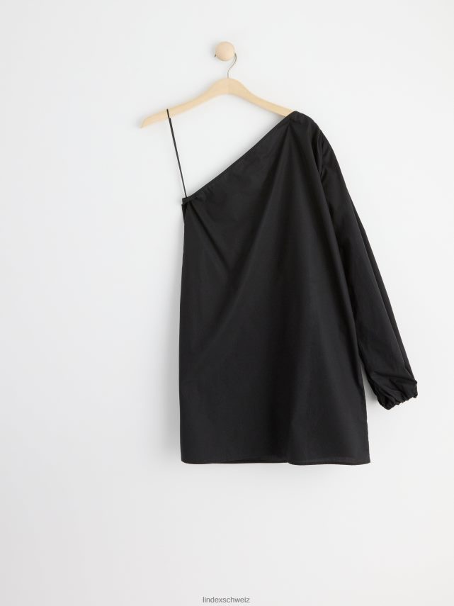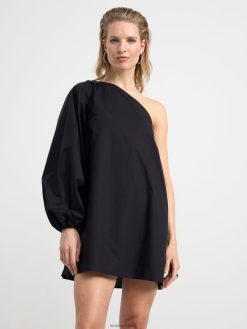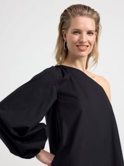 une robe courte et élégante en coton pima tissé, avec une épaule ouverte et une manche longue et large avec ouverture élastiquée.