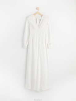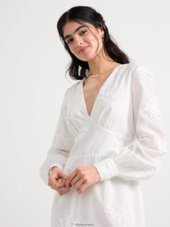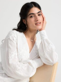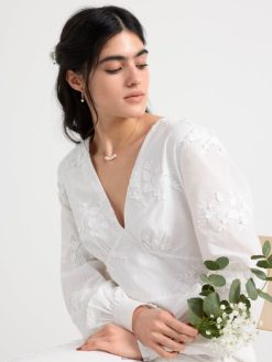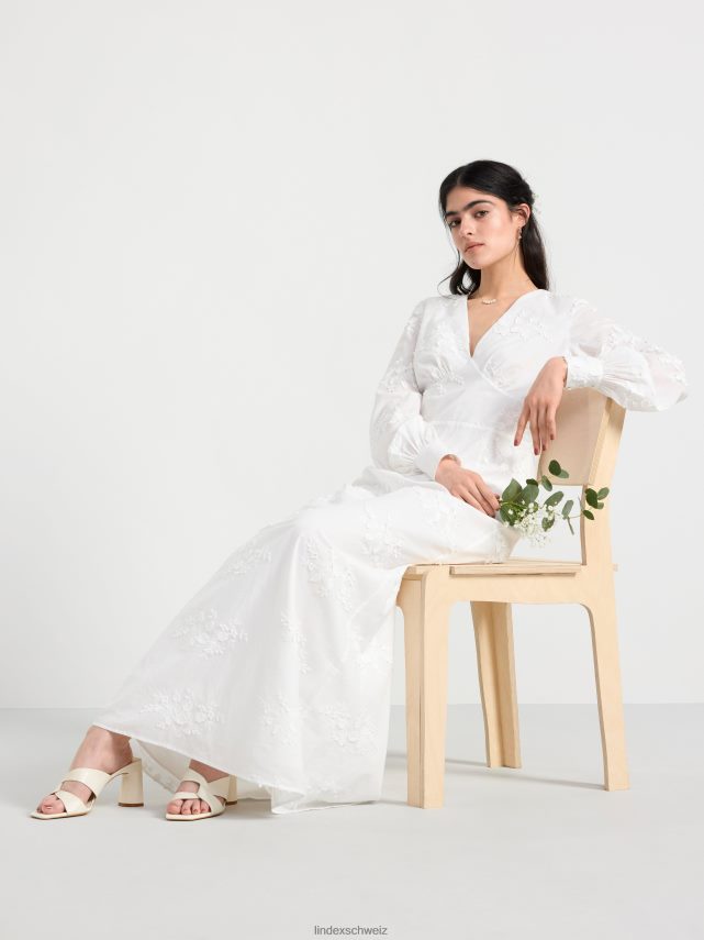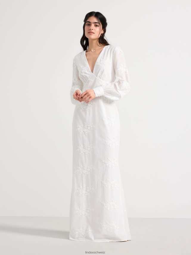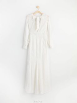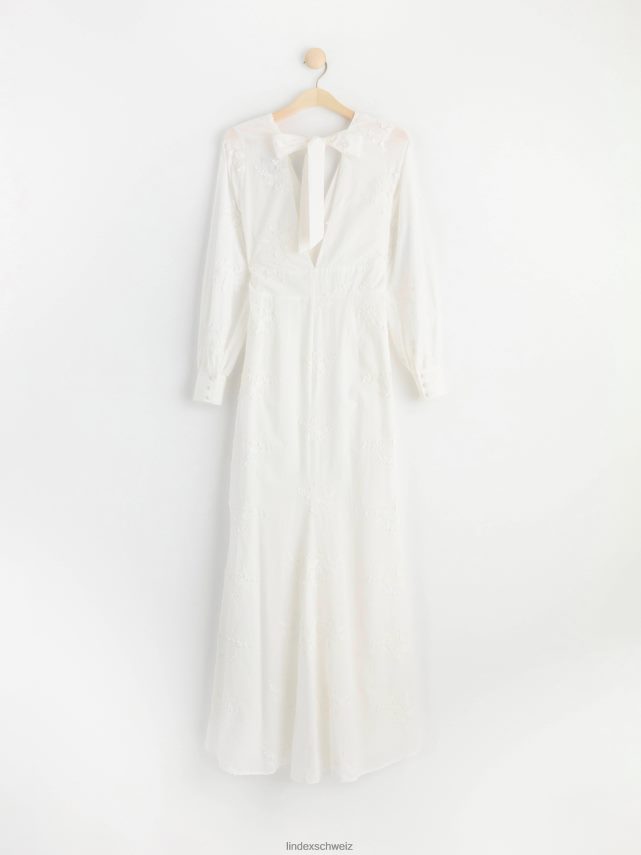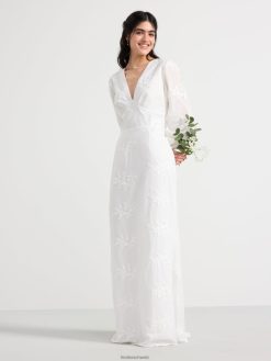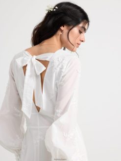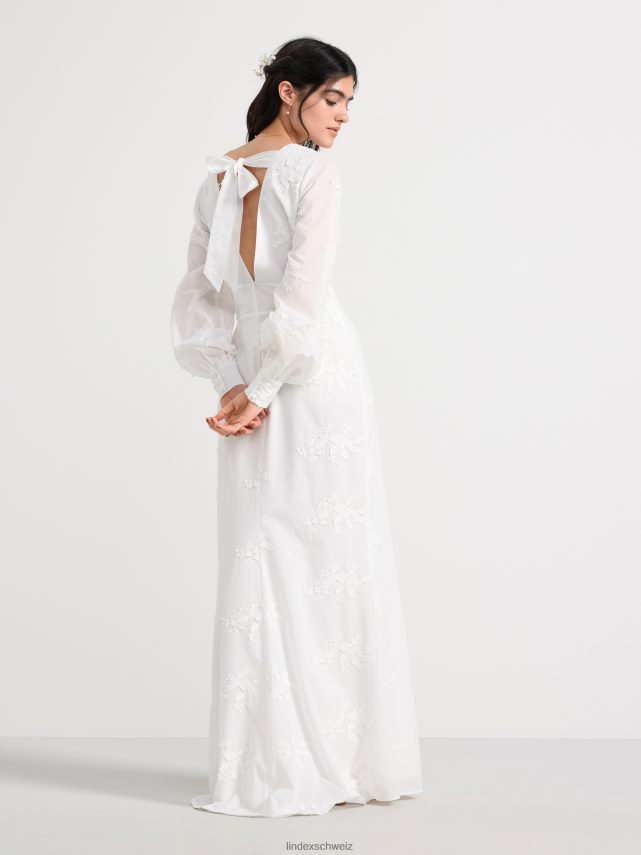 cette magnifique robe a de longues manches ballon avec des boutons habillés aux poignets, un décolleté en V profond et une couture buste flatteuse. le dos ouvert est décoré de larges bandes qui se nouent en un nœud. cette robe romantique en coton est ornée de fleurs en 3D et d’une silhouette flatteuse en forme de conte de poisson. une robe de rêve qui est le choix parfait pour un mariage ou comme robe de bal.