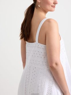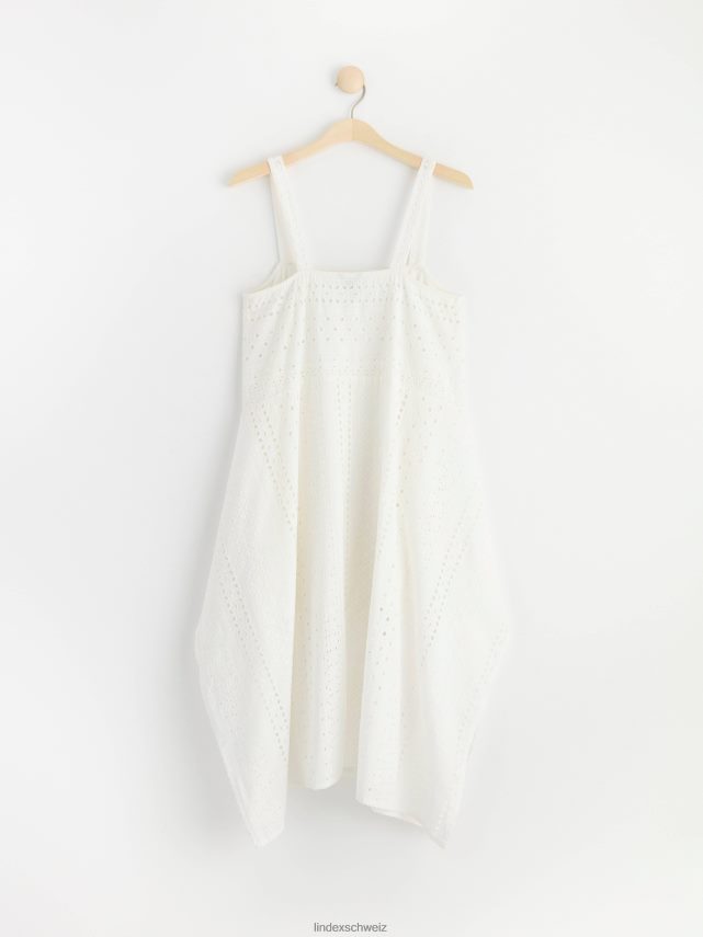 une robe mi-longue en coton doux avec une silhouette asymétrique, de larges bretelles et des broderies à trous sur l’ensemble. la robe d’été parfaite qui peut être portée de manière habillée ou décontractée en toute occasion.
