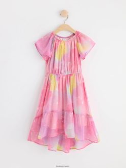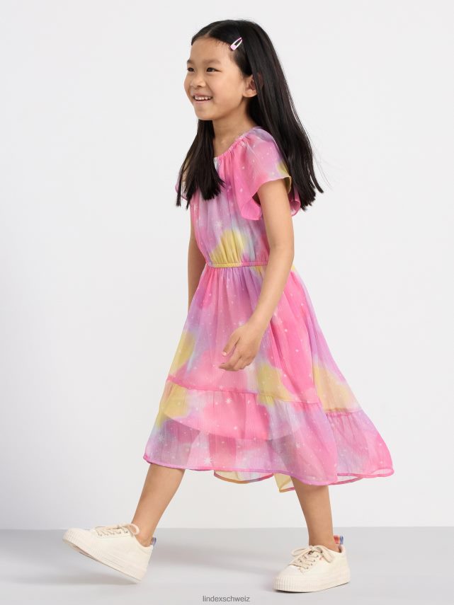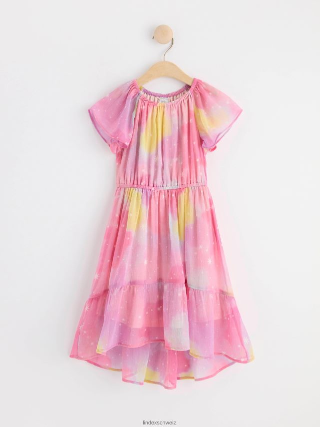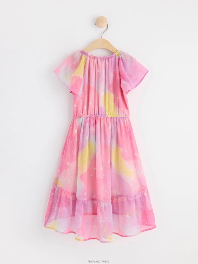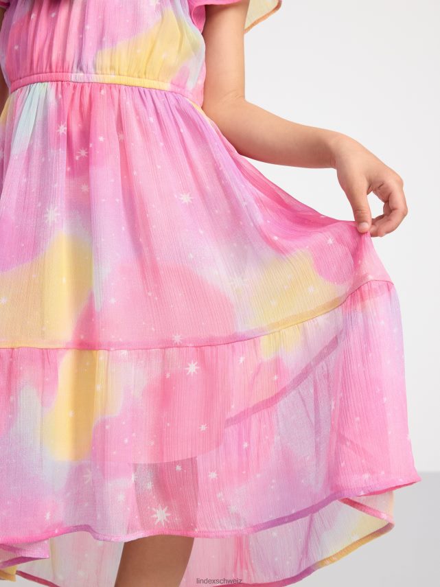 robe en mousseline à manches courtes, légère et fluide, avec un imprimé étoiles sur l’ensemble et un volant sur la jupe. matériel. cette pièce est partiellement fabriquée en polyester recyclé. Lorsque l’on utilise du polyester recyclé, cela signifie que des matériaux qui ont déjà été produits, comme les bouteilles en PET, ont une autre chance. il est beaucoup plus économe en ressources que la production de nouveaux matériaux, ce qui le rend meilleur pour l’environnement et réduit l’impact climatique.