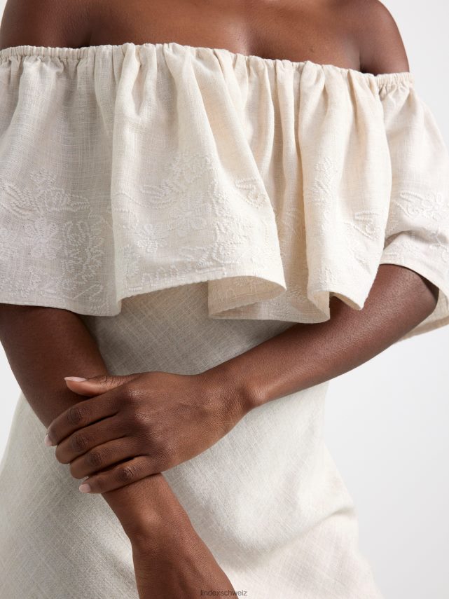 une robe longue fluide confectionnée dans un doux mélange de viscose et de lin, avec un grand volant orné de fleurs brodées. le col élastique peut être porté aussi bien sur l’épaule que hors épaule.