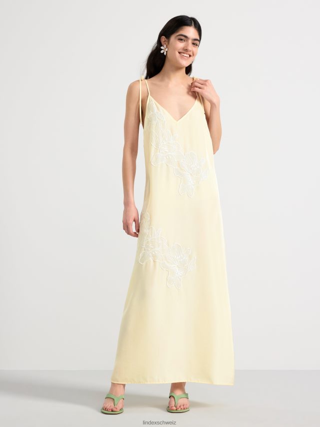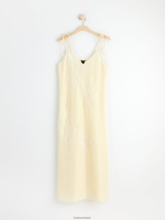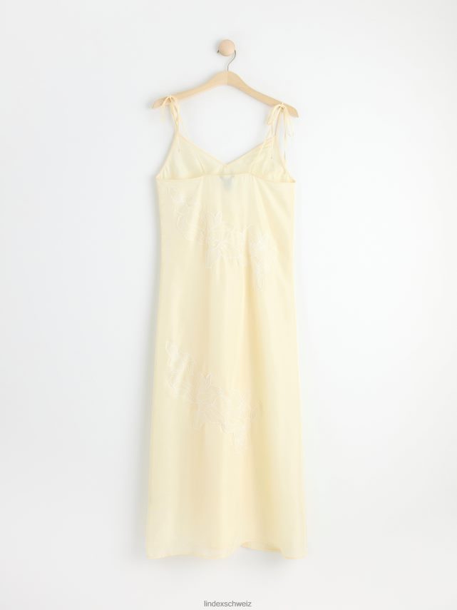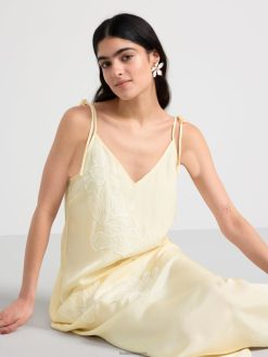 une robe nuisette longueur midi confectionnée dans un matériau satiné doux, avec de fines bretelles qui se nouent aux épaules et des fleurs brodées transparentes. matériel. cette pièce est partiellement fabriquée en polyester recyclé. Lorsque l’on utilise du polyester recyclé, cela signifie que des matériaux qui ont déjà été produits, comme les bouteilles en PET, ont une autre chance. il est beaucoup plus économe en ressources que la production de nouveaux matériaux, ce qui le rend meilleur pour l’environnement et réduit l’impact climatique.