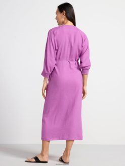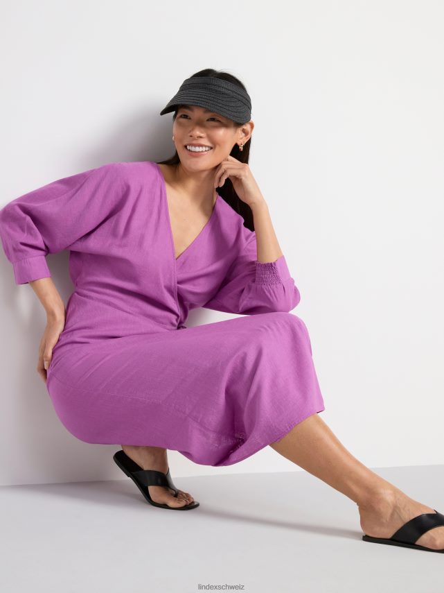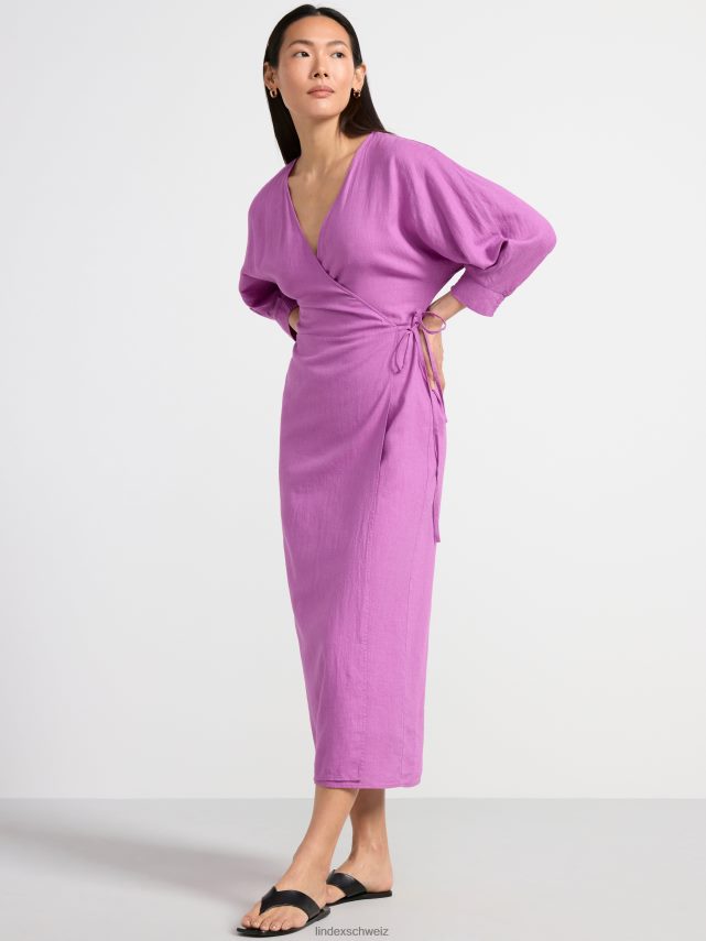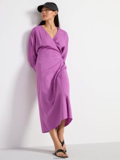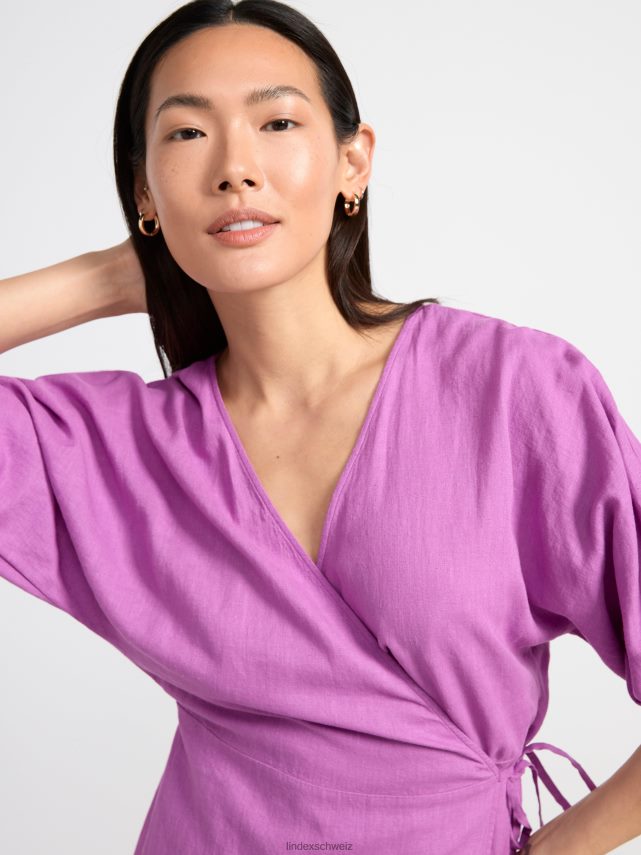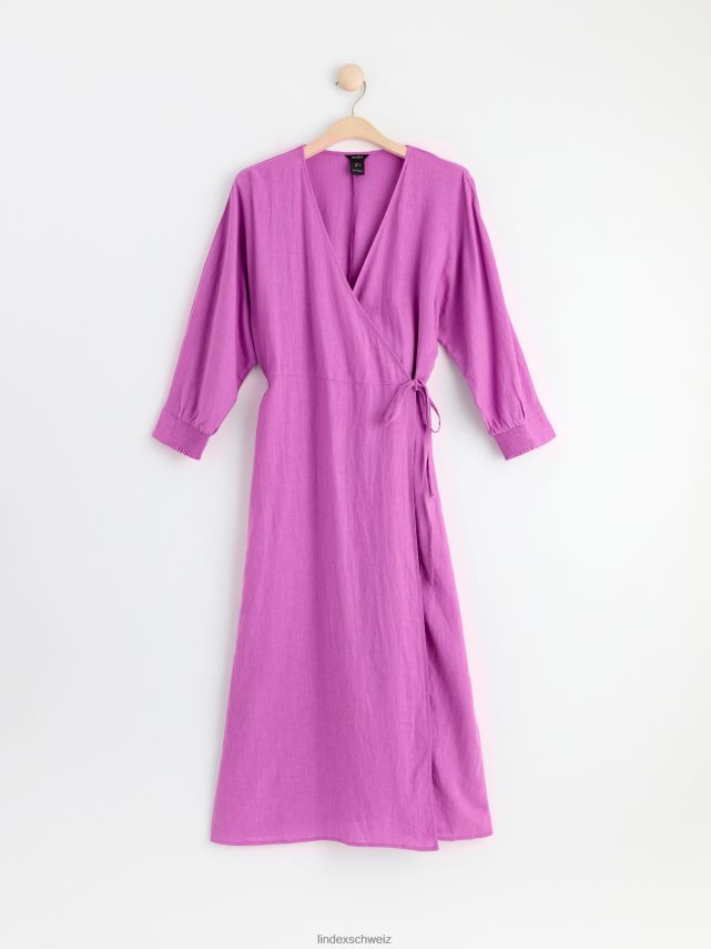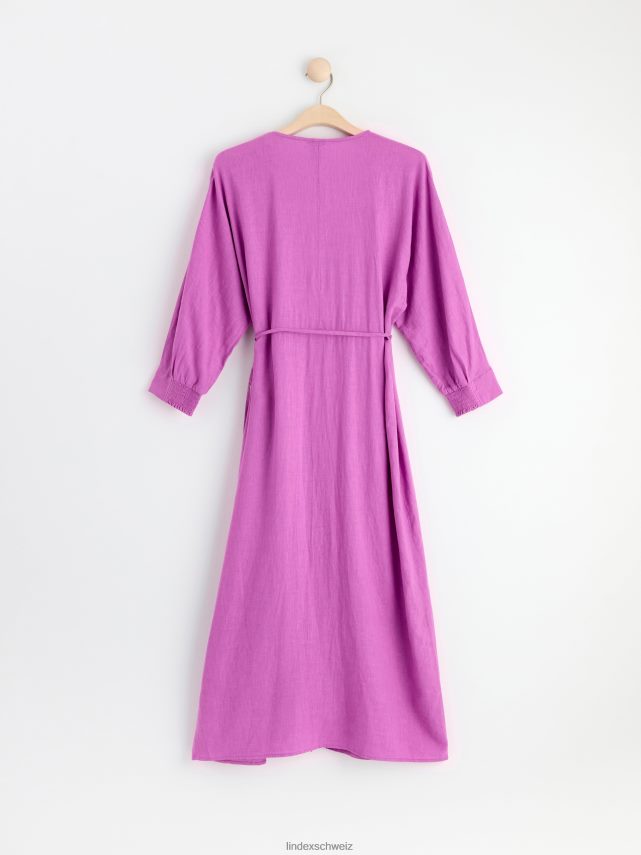 une robe portefeuille fluide avec des manches longues et une bande à nouer à la taille. prime. il s’agit d’une pièce de qualité supérieure, partiellement réalisée en lin. le lin est un matériau naturel aéré, durable et confortable à porter.
