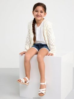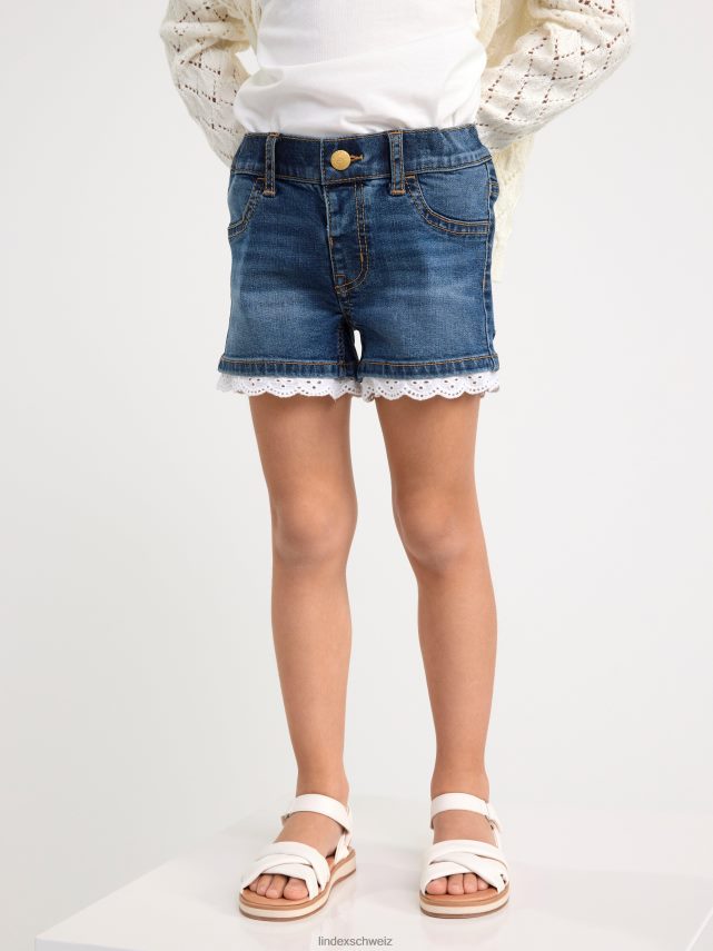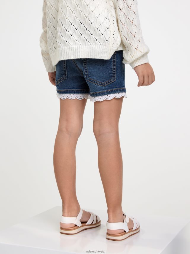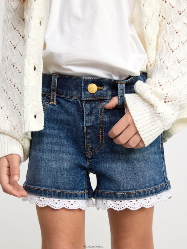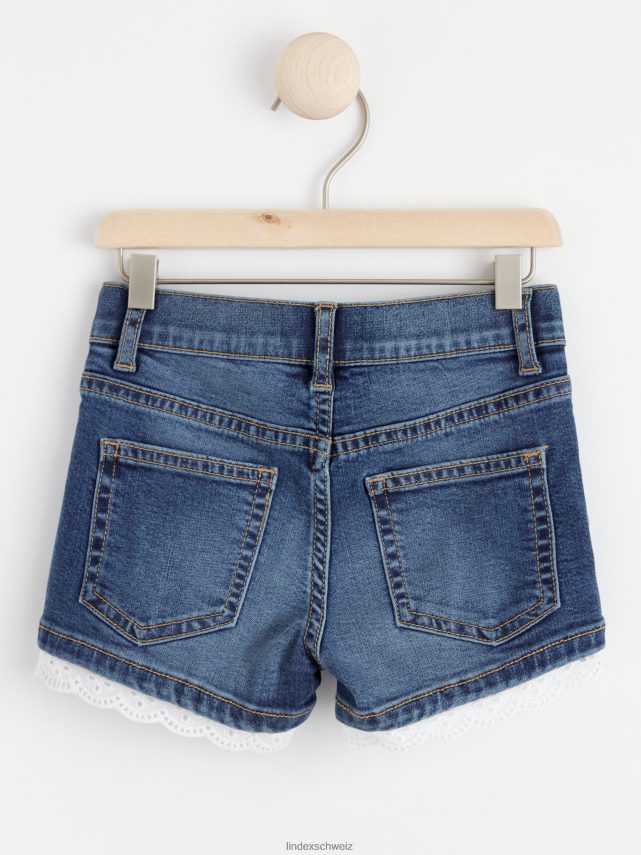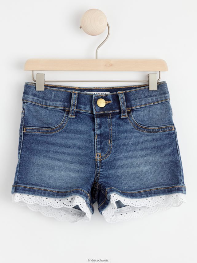 short en jean confortable avec une fine petite bordure en dentelle à motif troué autour des extrémités des jambes.