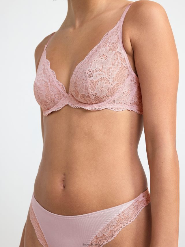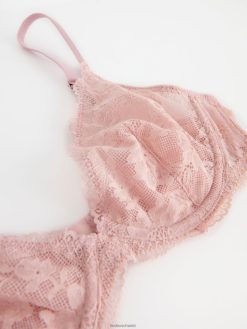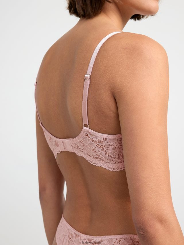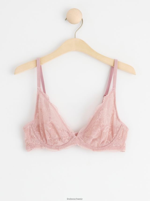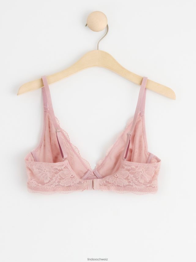 un soutien-gorge à armatures non rembourré confectionné en dentelle transparente et en maille douce avec un motif floral. le soutien-gorge a des bretelles fines et réglables et une fermeture au dos avec deux rangées de crochets et d’œillets.