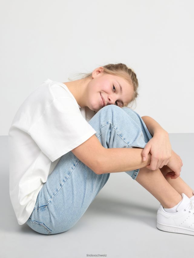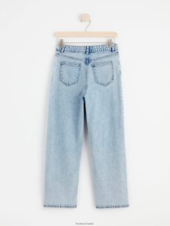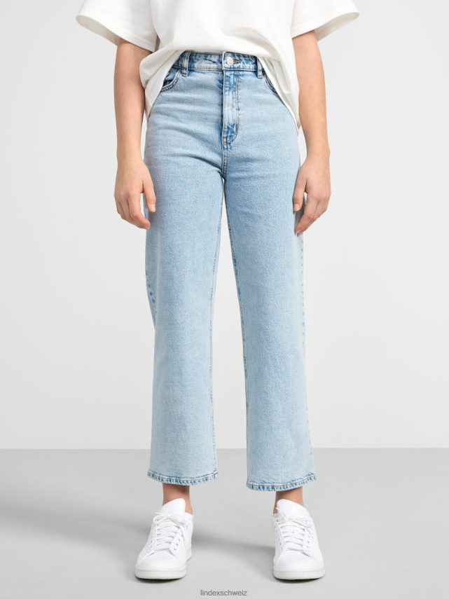 Jean confortable et robuste dans un délavage bleu clair avec une taille haute et une jambe large et courte.