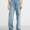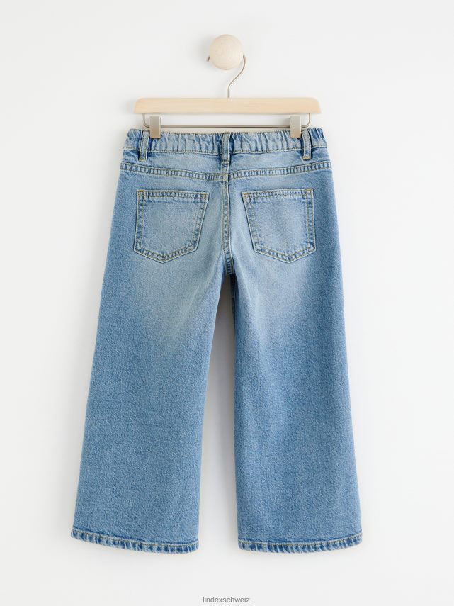 une paire de jeans en denim bleu doux et confortable avec une jambe large et courte et une taille élastiquée réglable classique. matériel. cette pièce est partiellement fabriquée en coton recyclé. en utilisant du coton recyclé, cela signifie que le coton qui a déjà été cultivé et qui aurait été gaspillé a une autre chance. il est beaucoup plus économe en ressources et en eau par rapport à la culture de nouveau coton.